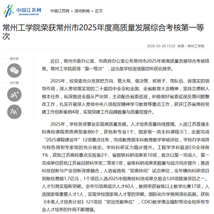 近日,常州市委办公室、市政府办公室公布常州市2025年度高质量发展综合考核结果。常州工学院获得“第一等次”,这也是学校连续第四年获此殊荣。