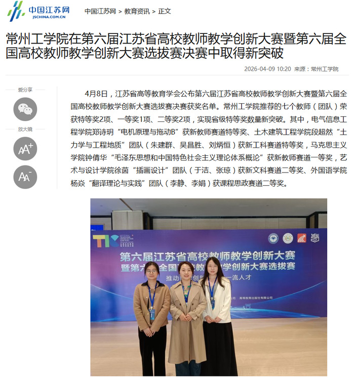 4月8日,江苏省高等教育学会公布第六届江苏省高校教师教学创新大赛暨第六届全国高校教师教学创新大赛选拔赛决赛获奖名单。常州工学院推荐的七个教师(团队)荣获特等奖2项、一等奖1项、二等奖2项,实现省级特等奖数量新突破。其中,电气信息工程学院郑诗玥“电机原理与拖动B”获新教师赛道特等奖、土木建筑工程学院段超然“土力学与工程地质”团队(朱建群、吴昌胜、刘炳恒)获新工科赛道特等奖,马克思主义学院钟倩华“毛泽东思想和中国特色社会主义理论体系概论”获新教师赛道一等奖,艺术与设计学院徐茵“插画设计”团队(于洁、张琼)获新文科赛道二等奖、外国语学院杨焱“翻译理论与实践”团队(李静、李娟)获课程思政赛道二等奖。
