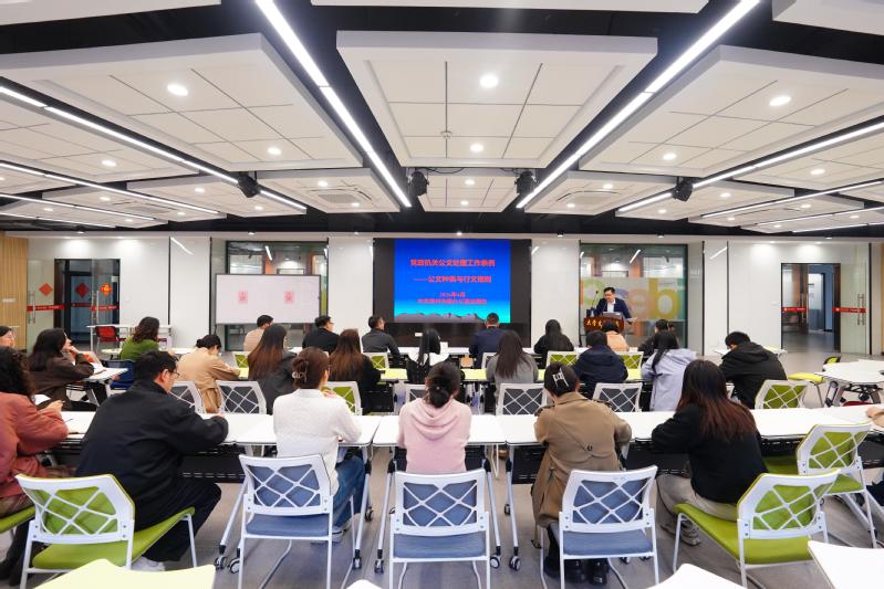 邹奕以《党政机关公文处理工作条例——公文种类与行文规则》为题作辅导报告。他结合多年公文审核与处理经验,系统讲解了公文的概念、种类、格式要素及行文规则,重点剖析了通知、报告、请示、函等常用文种的适用场景与写作要点。报告穿插大量真实案例,既有理论高度,又有实践深度,为机关青年厘清了公文写作中的常见误区。