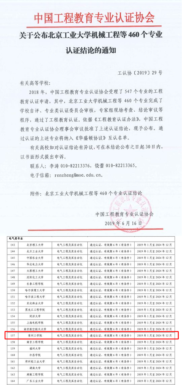 近日,教育部高等教育教学评估中心、中国工程教育专业认证协会正式发布《关于公布北京工业大学机械工程等460个专业认证结论的通知》(工认协[2019]29号),我校电气工程及其自动化专业名列其中,顺利通过工程教育专业认证,有效期6年(2019年1月至2024年12月)。