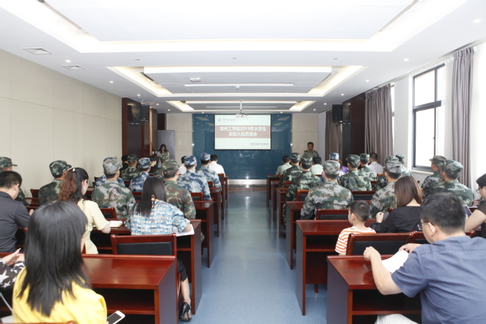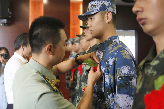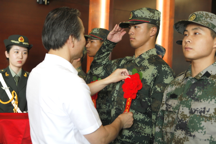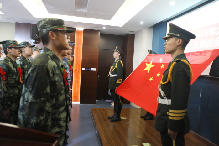 会上,学生工作部(处)、人武部部长吕莹璐宣读了我校2019年应征入伍的学生名单。汤正华和康志远一一为22位大学生新兵佩戴光荣花。火红的光荣花,凝聚的是祖国的召唤与人民的重托,召唤他们到祖国需要的地方去,鲜艳的红花也映红了年轻刚毅的脸庞,象征着他们即将投身的火热的军营生活。今年适逢新中国成立70周年,所有新兵集体向国旗敬礼,齐唱爱国军歌,嘹亮的歌声响彻会场。航空与机械工程学院黄冰清作为新兵代表表达了今后将服从命令、严守纪律、刻苦训练、努力学习、艰苦奋斗的坚强决心。电气信息工程学院党委副书记高静作为二级学院代表希望新兵们戎行不竭、努力进步,为国防事业建功立业。