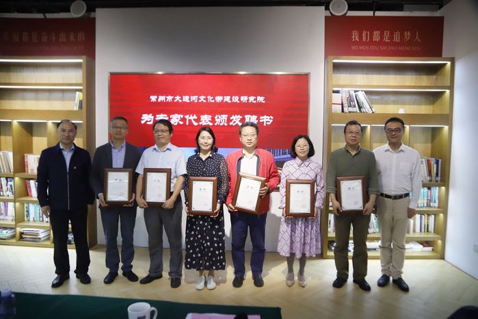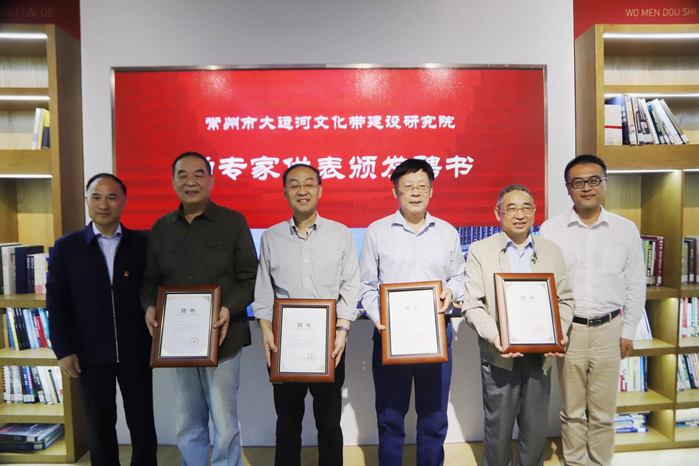 在现场进行的颁发聘书和授牌环节,曹雨平与谢春林分别为常州历史文化名城地方文史专家组组长邵志强等四位专家颁发了研究院顾问委员会委员聘书;为研究院大运河历史文献研究中心主任陆克寒等六位专家颁发了聘书;为常州运河五号创意产业发展有限公司执行董事、总经理赵洪波颁发研究院“展览展示中心”主任聘书。