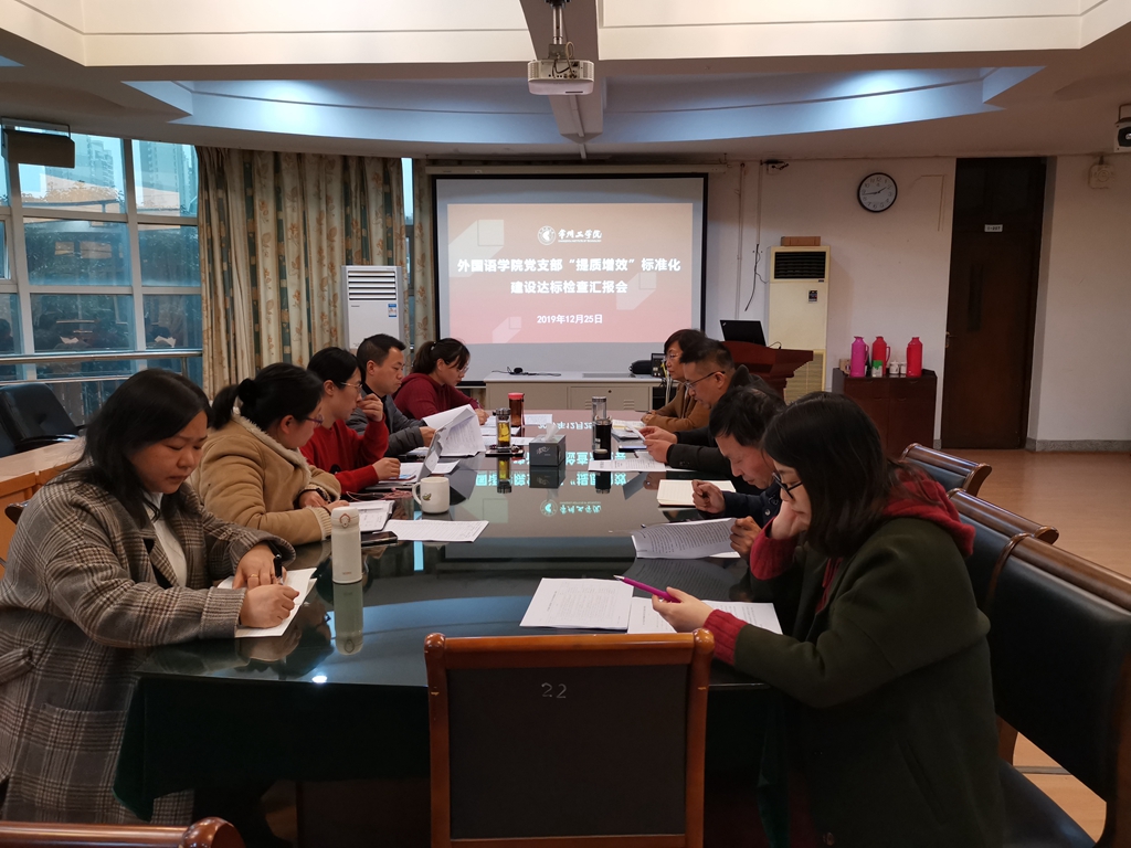 12月25日下午,外国语学院党委召开党支部“提质增效”标准化建设达标检查汇报会。
