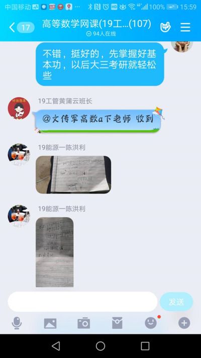 主讲课程《高等数学A(下)》。针对高等数学的概念抽象、理论严谨、计算复杂等特点,在课前文老师在个人微博发布异步SPOC教学源视频和自拍教学视频,供学生提前预习;将教学内容PPT、练习题等在班级教学QQ群发布,并指导学生提前预习和检测学习效果。