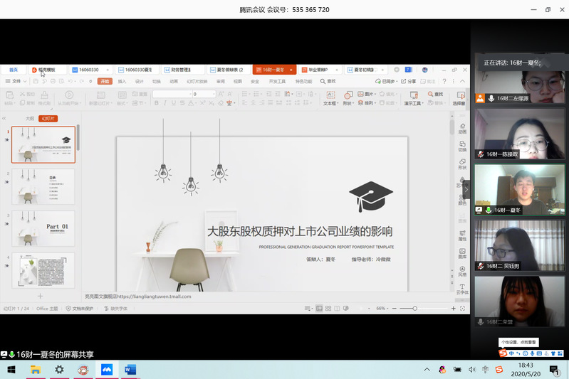 5月20日,经济与管理学院财务管理系2020届毕业生第一批线上论文答辩会如期举行。40位学生以分组方式进行答辩,采用分享屏幕汇报的方式对自己论文的主要内容和核心观点等进行陈述。随后答辩老师提出问题,学生经过一定时间的思考和准备后回答老师的提问。最终,答辩组老师根据学生答辩情况进行打分。与现场答辩过程一样,整个线上答辩过程严谨、有序。