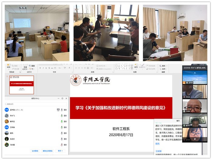 随后,各支部组织全体教职工通过现场或视频会议等形式传达学习了《关于深入学习贯彻<加强和改进新时代师德师风建设的意见>的通知》、《常州工学院高校教师师德手册》以及教育部等七部门印发的《关于加强和改进新时代师德师风建设的意见》等文件精神。