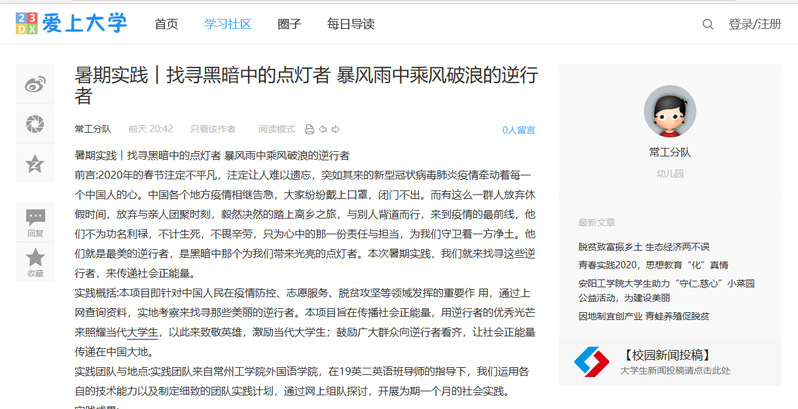 为深度发掘疫情中的感人事迹,学习先进典型,外国语学院以“抗疫感人事迹推送小分队”线上组队的方式,在朱月兰老师的指导下,经过前期实践准备、查找资料和站外宣传,开展了对疫情期间感人事迹的学习,并在线上积极为感人事迹发声。