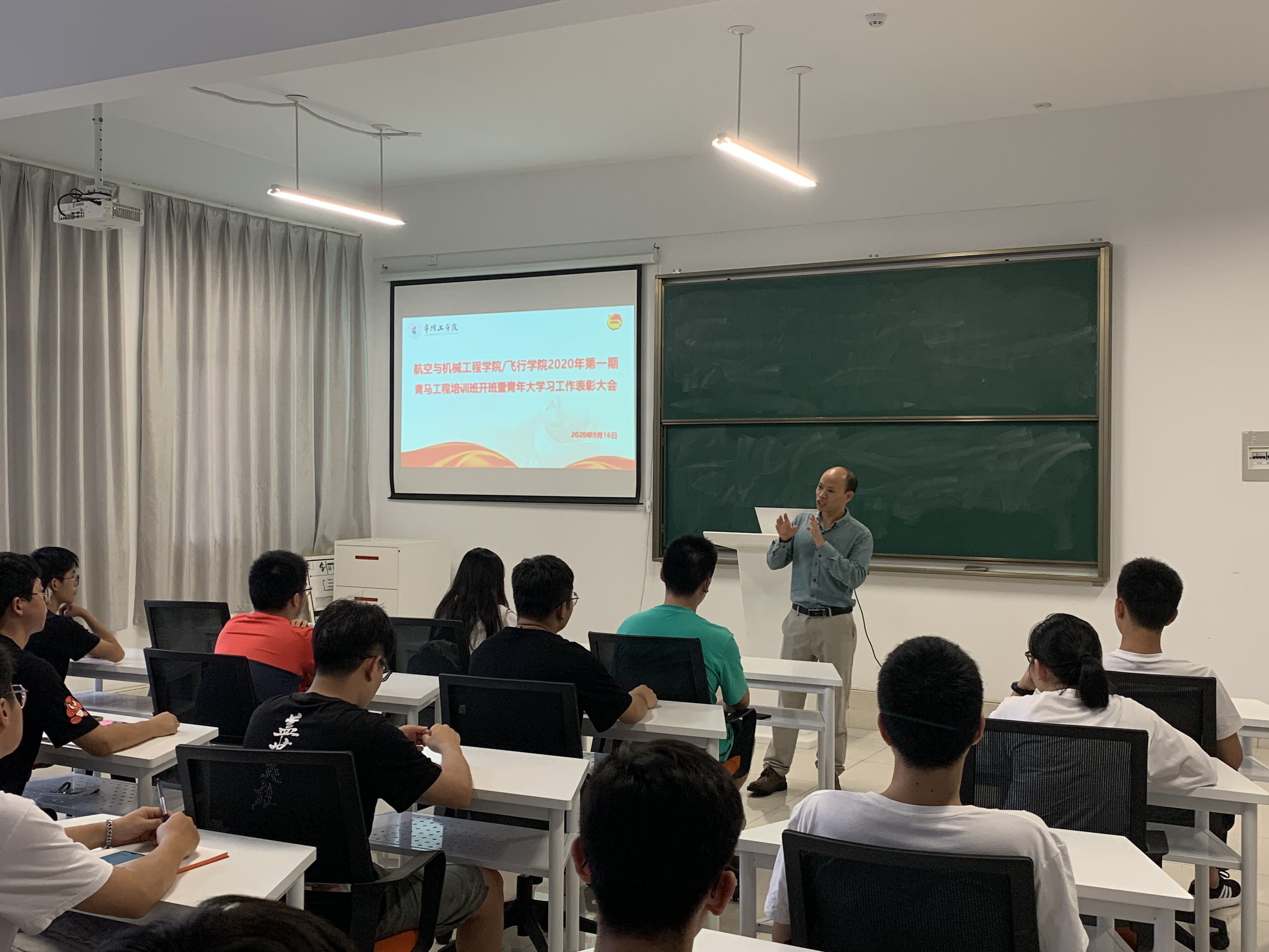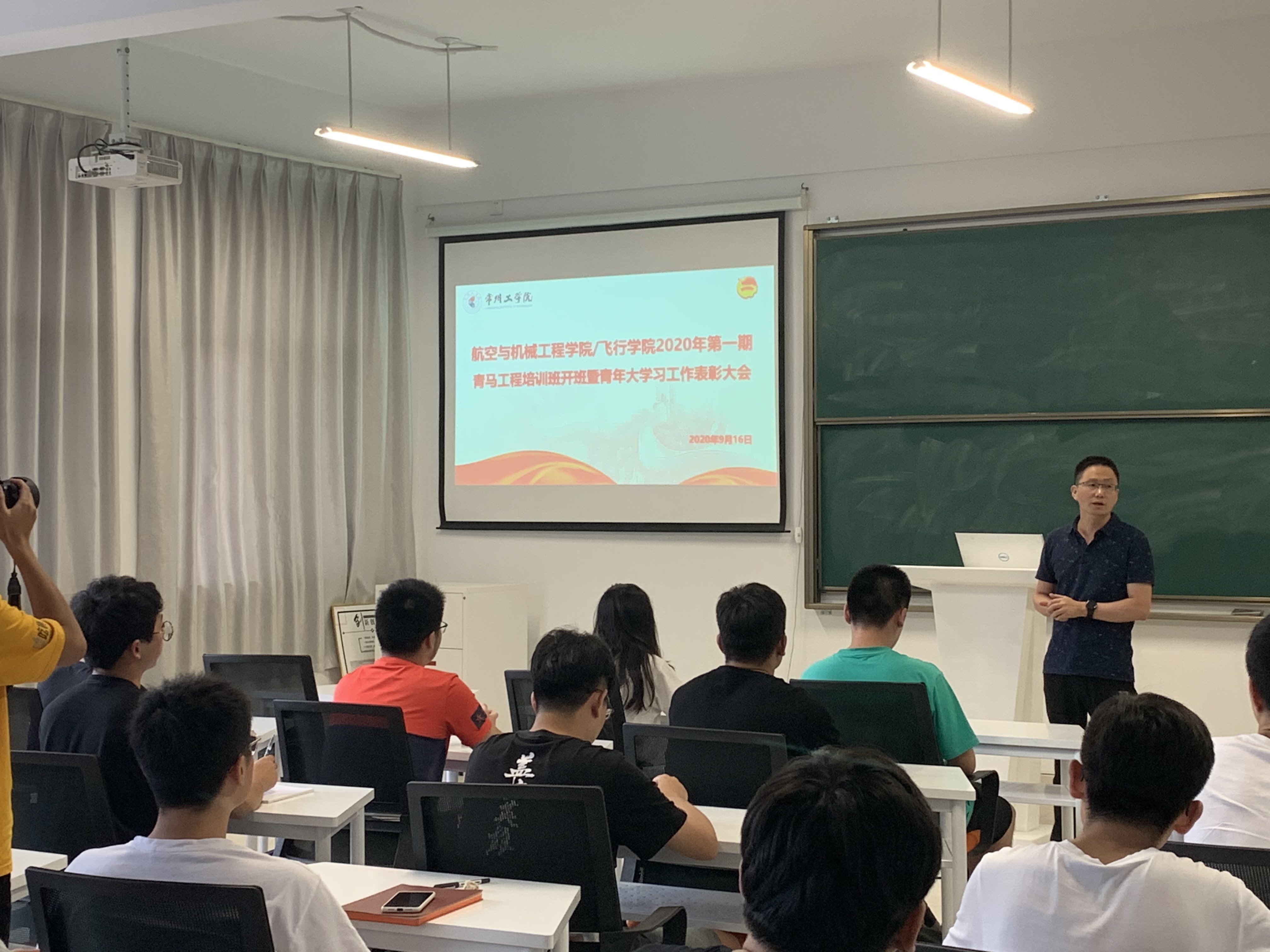 为深入学习习近平总书记在全国新冠肺炎疫情表彰大会上的重要讲话精神,用习近平新时代中国特色社会主义思想武装全团、教育青年,引导团员青年坚定理想信念,牢记使命担当,积极践行爱国奋斗精神,牢固树立家国情怀。9月16日,航空与机械工程学院/飞行学院在天权楼A407举行青马工程培训班开班暨青年大学习工作表彰会议。学院党委副书记姜卫、学工办主任王爱祥、辅导员冉育彭、尹传忠参加会议。