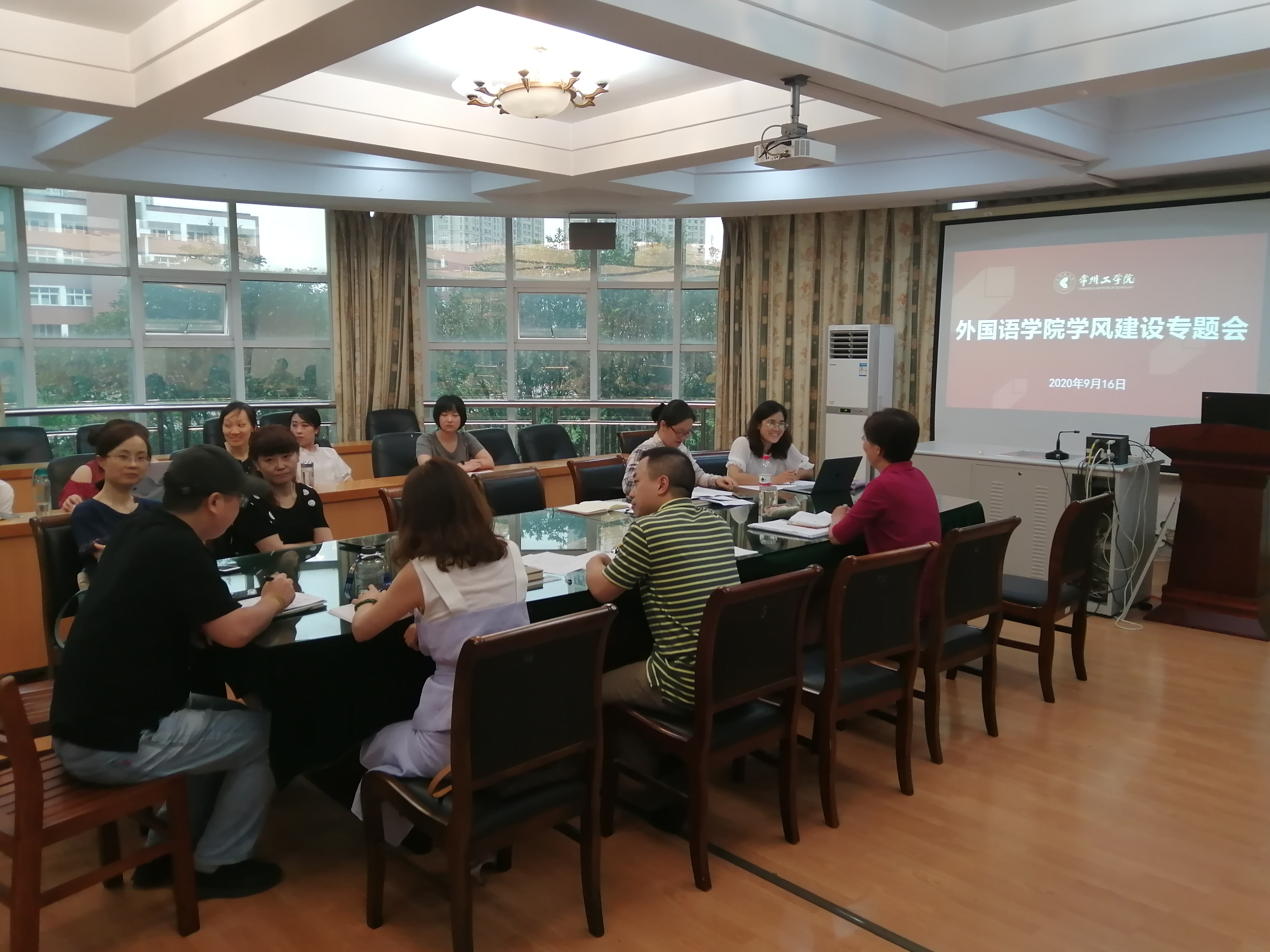 学院党委副书记俞贤辉就学院学风建设做总体情况介绍,副院长朱江就教风、学风和班风建设以及如何加强教学融合发表意见看法。2020年16商英四班和16英语二班班级考研出国升学率均超过23%,两位班主任顾晓波和邓平平分别做学生考研动员和班级学风建设经验分享。商务英语系党支部书记施云波就专业系层面如何强化学风引领谈具体做法,其他参会人员畅谈如何根据学生学业发展特点,激发学生学习兴趣和潜能,落实落细学生大学学业规划和职业规划。
