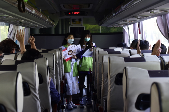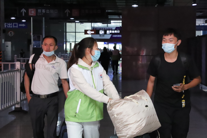 凌晨五点,志愿者们统一着装,统筹物资前往迎新站点。车站候车室前设有新生打卡拍摄点,摄影志愿者们热情地为每一位新生家庭留下入学第一张照片。接站车辆上,讲解员志愿者为新生及家长介绍学校校史及校园环境,加深新生对学校发展历程以及未来学习生活的了解,帮助他们更快地融入新的环境。车上还进行了有奖互动问答活动,志愿者们为新生准备了印有“新生2020”字样的钥匙扣和小抱枕,寓意着从现在开始,彼此心与心相连,传递温暖与关怀。到达学校后,校园内设有接驳车和各学院“一对一”服务志愿者,帮助新生搬运行李,去往宿舍和各学院的报到处。
