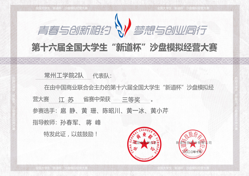 9月24日至26日,以“青春与创新相约 梦想与创业同行”为主题的第十六届全国大学生沙盘模拟经营大赛江苏省决赛(全国半决赛)以网络赛形式举行。我校经济与管理学院派出的2支代表队在孙春军、蒋峰两位老师的指导下,分别荣获二、三等奖。