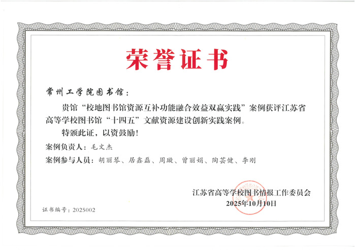 近日,江苏高校图书馆“十四五”文献资源建设创新实践案例评选结果公布,我校图书馆报送的“校地图书馆资源互补、功能融合、效益双赢”实践案例成功入选,并受邀在省高校图工委文献资源建设专委会2025年年会现场作分享,其创新模式与实践成效获全省高校图书馆同行高度认可。