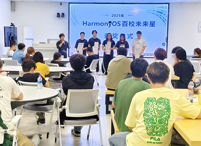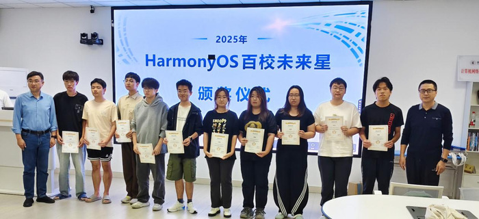 活动现场,院党委副书记陶骏、副院长奚吉为认证学员代表颁发证书,并为于明轩、於宣含授高级认证;李晓芳为五位“2025年HarmonyOS百校未来星”获得者颁奖,现场气氛热烈。
