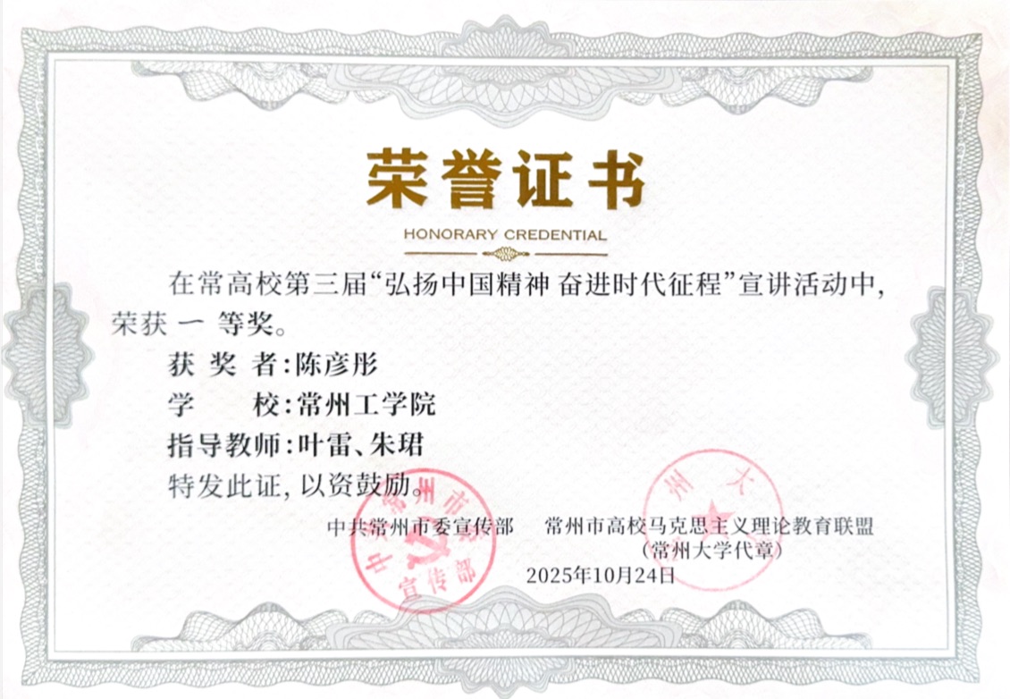 10月24日,由中共常州市委宣传部、常州市高校马克思主义理论教育联盟主办的在常高校第三届“弘扬中国精神 奋进时代征程”宣讲活动举行。14所在常高校选手参赛,“常小燕”大学生理论宣讲团志愿者陈彦彤以《战火中的常州记忆》为题,从 “保卫家乡”“建设家乡”“永争第一”三个角度宣讲抗战精神在常州的传承与发扬,凭借精彩表现荣获本届宣讲活动决赛一等奖。
