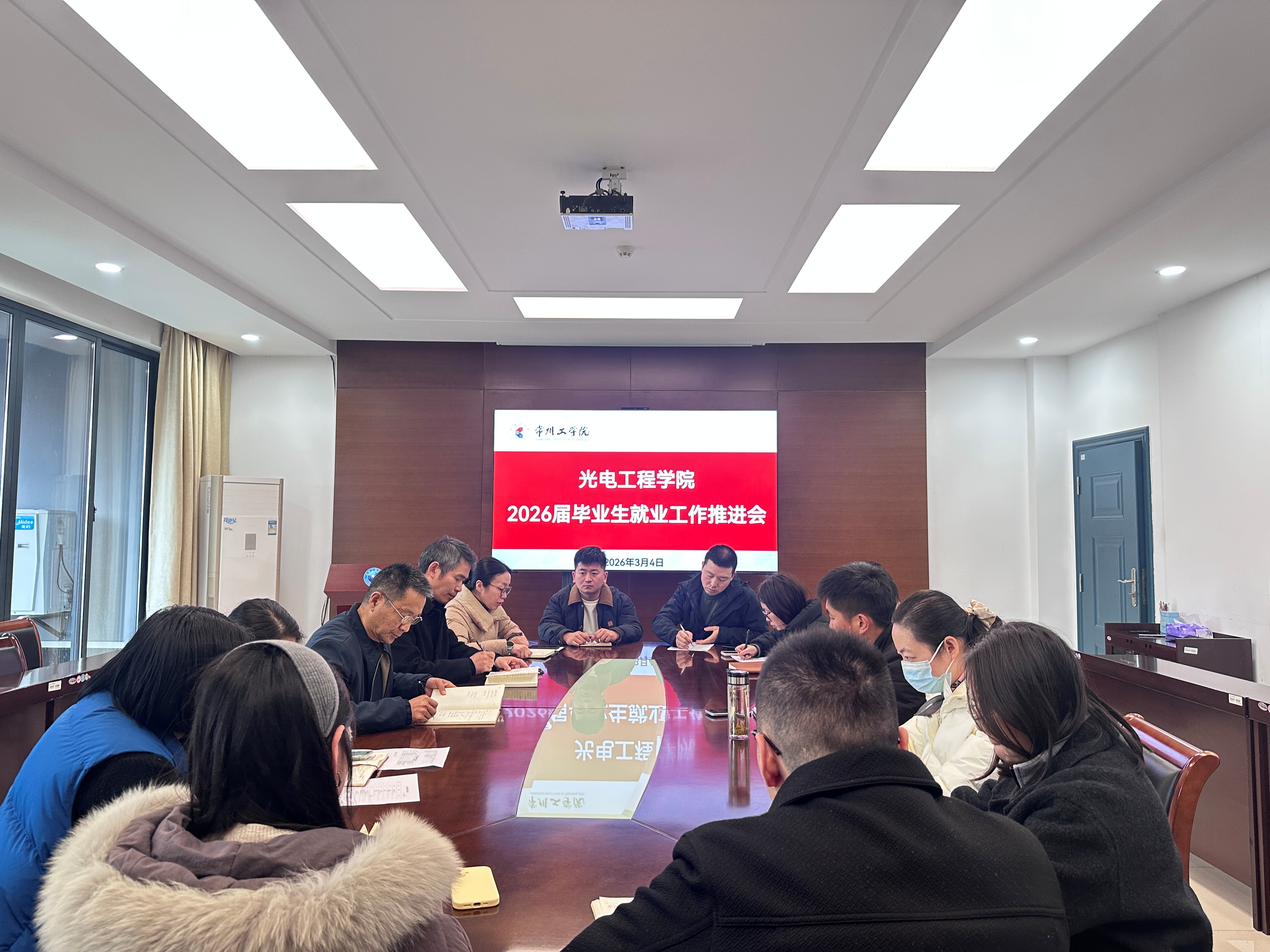 3月4日,光电工程学院在玉衡楼A518会议室召开2026届毕业生就业工作推进会。学院全体党政领导、系主任、教工党支部书记、2022级班主任及辅导员参会,会议由学院党委副书记付志荣主持。