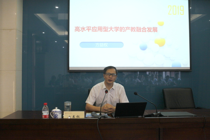 上午,全体参训人员认真聆听了由副校长王传金主持的两场专题报告。在题为《高水平应用型大学的产教融合发展》的报告中,温州职业技术学院院长方益权从国家发展战略定位、教育发展战略定位、区域发展战略定位、地方高校发展战略定位四个层面详细介绍了高水平应用型大学产教融合发展的背景。在深刻分析产教融合现状和难点基础上,方权益以温州大学推进高水平应用型大学建设和产教融合发展的探索和实践为典型案例,从观念再造、系统再造、人员再造等视角,全面阐释了高素质应用型人才培养的路径和方法,提出了地方院校探索产教融合和创新创业的一系列独到见解。