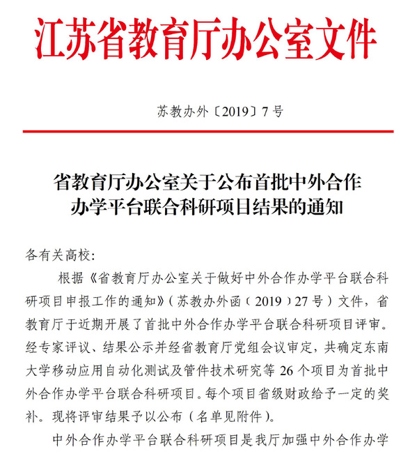 为贯彻落实省委省政府《关于做好新时期教育对外开放工作的实施意见》及省“十三五”教育发展规划有关要求,进一步加强中外合作办学内涵建设,江苏省教育厅自2015 年起开始实施高校中外合作办学高水平示范性建设工程,我校软件工程、学前教育和土木工程三个中外合作办学项目全部入选。2019年,省教育厅在中外合作办学高水平示范性建设工程中,新增了“中外合作办学平台联合科研项目”,旨在引导高校合作办学由人才培养向合作科研延伸,促进中外合作办学提质增效。