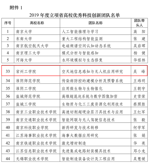 近日,省教育厅发文公布2019年度江苏高等学校优秀科技创新团队遴选结果,我校以吴峰教授为团队带头人的“空天地信息感知与无人机应用研究”创新团队榜上有名,成为我校首个省高校优秀科技创新团队。