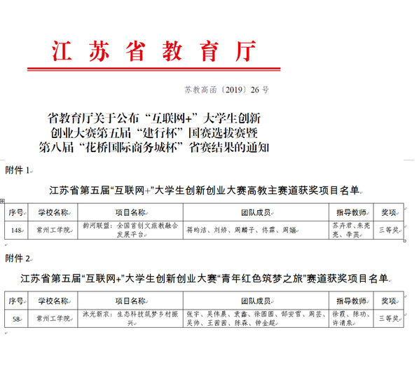 近日,“互联网+”大学生创新创业大赛第五届“建行杯”国赛选拔赛暨第八届“花桥国际商务城杯”江苏省赛结果揭晓。我校艺术与设计学院申报的项目“韵河联盟:全国首创文旅教融合发展平台”(团队成员:蒋昀洁、刘娇、周麟子、佟霖、周婳,指导教师: