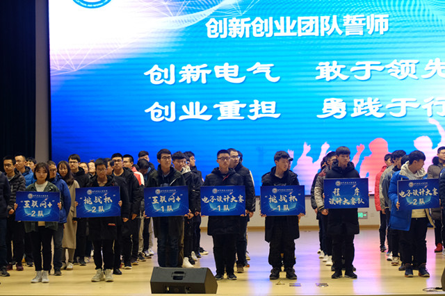 在誓师环节,院长毛国勇带领12个创新创业团队庄重宣誓:“创新电气,敢于领先;创业重担,勇践于行!”声音清晰洪亮,展现了师生勇于突破、敢于挑战的创新创业精神。同时阐释了学院创新创业工作规划,表示学院将以此誓师大会为契机,鼓励更多的教师和学生投身到创新创业竞赛工作中来,让学院的创新创业氛围和考研氛围一样浓厚。