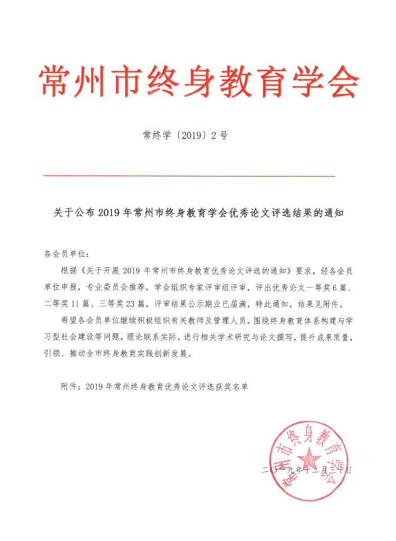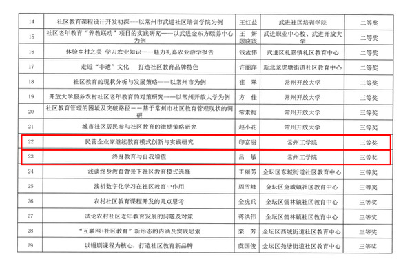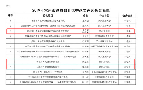 近日,常州市终身教育学会公布2019年常州市终身教育学会优秀论文评选结果,我校苗贵松、孙钦荣合写的《常州社区老年大学教师教学发展的维度和路径》论文荣获一等奖,魏际兰、张志欣的论文分获二等奖,印富贵、吕敏的论文分获三等奖。
