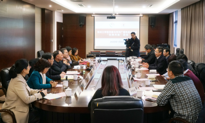 1月8日下午,常州广播电视台党委书记、台长、常州市新闻工作者协会主席汪忠泽及其党委领导班子一行10人来校,与我校党委开展党建“先锋共建”活动。校领导曹雨平、汤正华、王传金、朱锡芳、汪群携党委办公室、党委组织部、党委统战部、党委宣传部负责人与来宾亲切交流。校党委书记曹雨平主持座谈会。