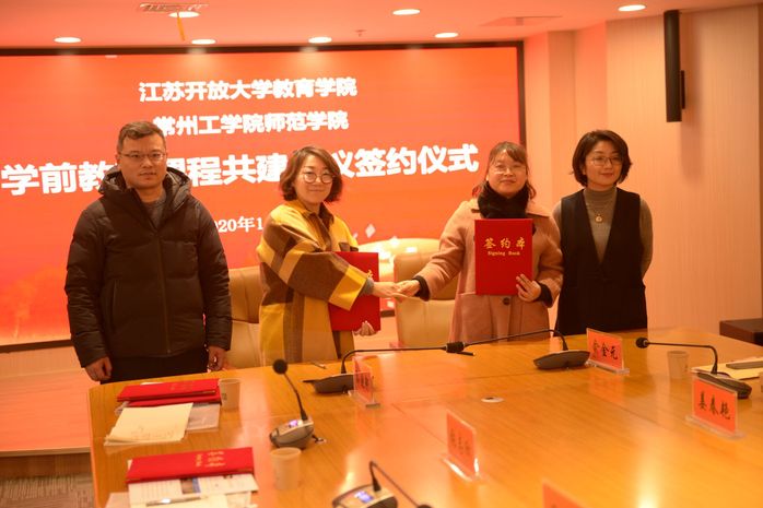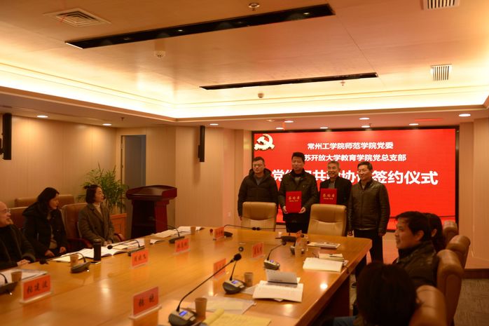 在参会人员的共同见证下,江苏开放大学教育学院党总支部书记俞金元与师范学院党委书记肖华签署党建工作合作协议,江苏开放大学教育学院8门课程负责人依次与我校相关主讲教师签署在线课程建设合作协议。