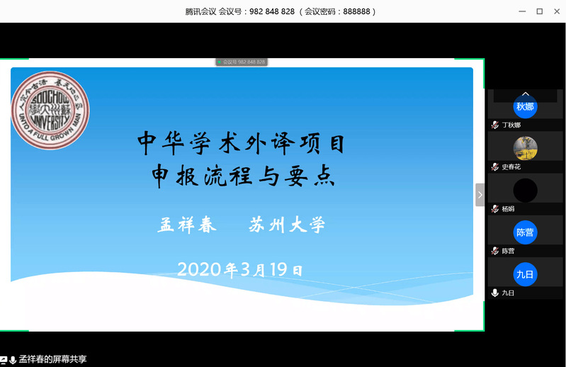 为鼓励教师积极申报国家社科基金“中华学术外译项目”,3月18日下午,外国语学院特邀请苏州大学外国语学院副院长孟祥春博士就如何认识和开展“中华学术外译项目”申报事项作线上辅导报告。会议由外国语学院副院长马霞主持。院长李静致欢迎辞。30余位教师线上聆听报告。