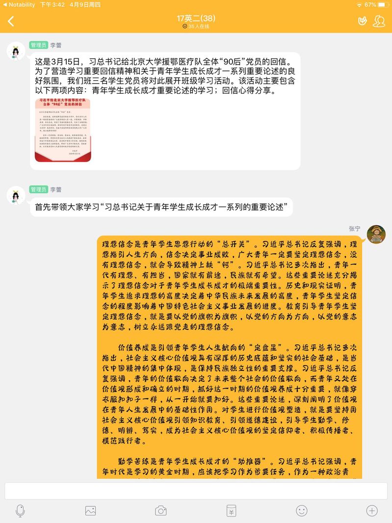院党委书记刘一鸣、副书记俞贤辉和副院长朱江分别寄语学生党员,学生党员也自发进行“云接力”, 他们带着自己的学习收获,作为“领学员”来到各个班级,组织开展主题团日活动,引领各班青年学生开展大学习和大讨论,在学院上下营造出学习习近平总书记重要回信精神和关于青年学生成长成才一系列重要论述的良好氛围。