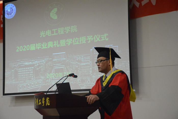 春华秋实,桃熟流丹。7月5日至7日,光电工程学院2020届学生毕业典礼暨学位授予仪式在图书馆一楼报告厅隆重举行。院党委书记蒋渭忠、院长潘雪涛、副院长杜文汉等学院党政领导及各专业系教师出席活动。毕业典礼由院党委副书记付志荣主持。