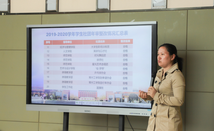 李殷作培训。她详细介绍了社团活动的申报流程和具体要求,讲解了2019-2020年年审不合格社团的整改情况,以及2020年度社团星级评定结果,总结以往工作的不足,对新一年社团年审和星级评定分别指导。