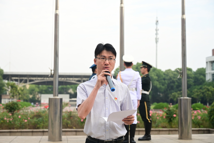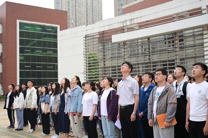 仪式在《解放军军歌》歌声中拉开序幕。国旗班成员迈着矫健的步伐,护着鲜艳的五星红旗走向升旗台。随着国歌奏响,五星红旗冉冉升起,全场师生肃立,行注目礼,高唱国歌。