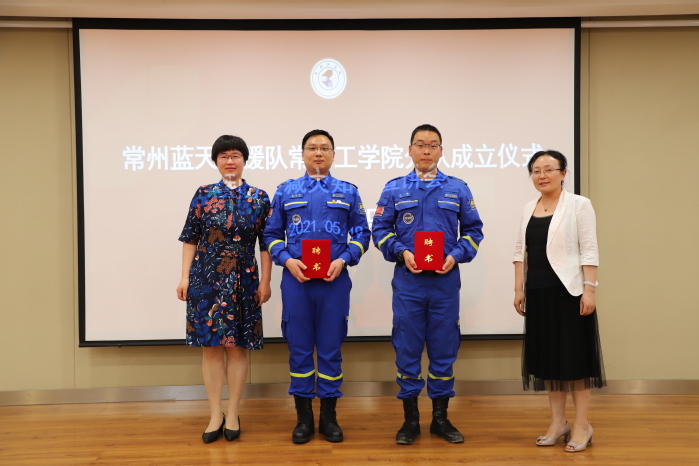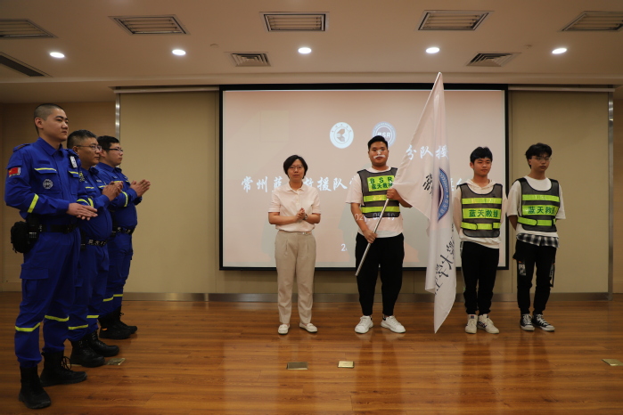 田辉宣读常州蓝天救援队常工院大学生队成立文件,曹媛媛为常工院大学生队授旗,许文婷、陈晓庆分别为田辉、王玉亭颁发社团校外指导教师聘书,学生代表宋自欣发言。