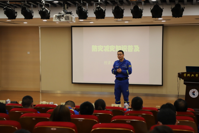 仪式结束,蓝天救援队队长田辉为大家进行了防灾减灾知识专题宣讲。