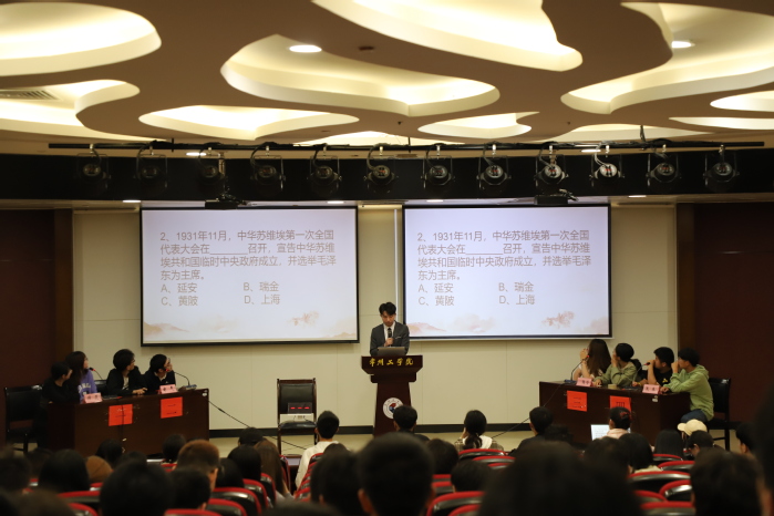 为进一步丰富广大团员青年的党史知识储备,厚植同学们爱党、爱国、爱社会主义的情感,5月19日,常州工学院“读党史争上游”党史知识竞赛决赛在辽河路校区图书馆一楼报告厅举行。经过初赛选拔的8支二级学院代表队在此进行决赛的角逐,160余名观众观看比赛。