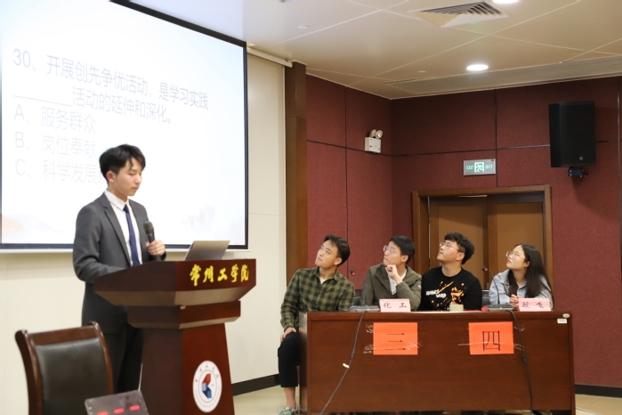 竞赛第一轮环节为轮流答题,各二级学院代表队依照抽签顺序分两组上台答题。随着难度升级,各队比分逐渐拉开差距,场上氛围渐趋热烈。经过第一轮的激烈比拼,汽车工程学院、电气信息工程学院、人文学院、化工与材料学院代表队脱颖而出,成功晋级。在接下来的抢答环节中,选手们争先恐后,互不相让。现场气氛高涨,观众掌声不断,本轮化工与材料学院代表队暂时领先。最后一个环节为风险题,分为条件题与选答题。此环节无疑成为或赶超逆袭或拉开差距的最后机会。最终,汽车工程学院代表队田贵钰、沈炜荣获一等奖;化工与材料学院代表队单泽忠、王意获得二等奖;人文学院代表队魏晓、张易安获得三等奖。