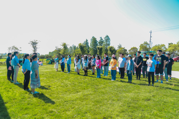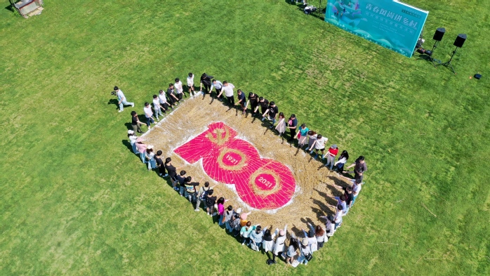 活动开始,志愿者们体验秸秆回收、共绘秸秆画以庆祝中国共产党成立100周年。在当地农民的悉心指导下,学生们各自分工,组成最佳搭配,男生们纷纷拿起镰刀,下到农田割秸秆,女生们细心地将割下的秸秆收拢成捆。志愿者们共同把成捆的秸秆排布在红布上,制作完成献礼建党100周年的秸秆画。紧接着,志愿者们在室内聆听了常州方圆再生能源开发有限公司及常州西源污水处理有限公司负责人关于秸秆回收利用、污水处理环保知识宣讲,详细了解了污水处理厂污水处理流程和秸秆制作生物质颗粒工艺,通过秸秆综合利用,缓解秸秆等焚烧带来的大气污染影响,改善空气环境质量。