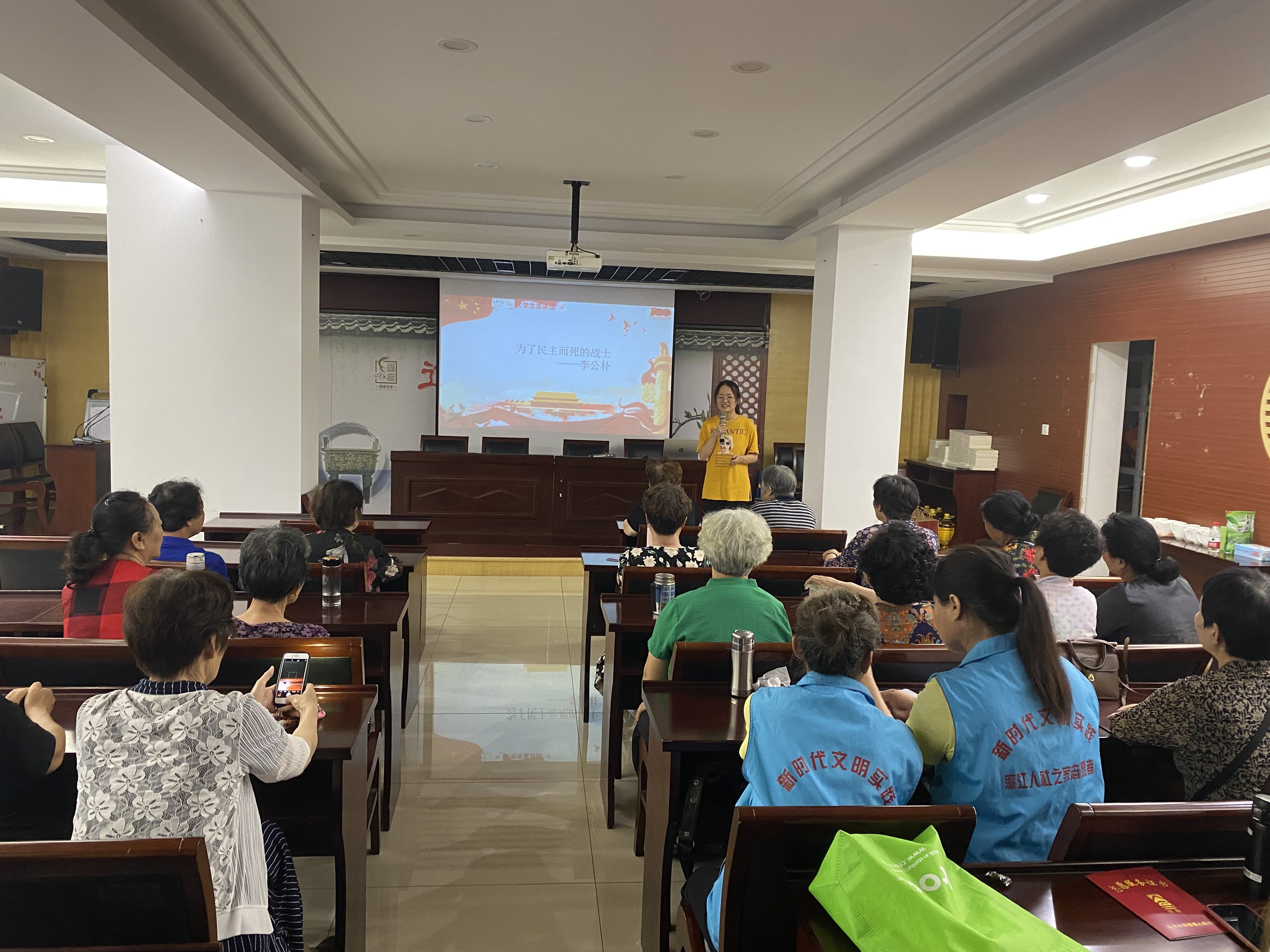 志愿者黄海燕为社区居民介绍了“常小燕”这支队伍,以“缅怀革命先烈,开创美好未来”为题,讲述了民主战士李公朴的故事。