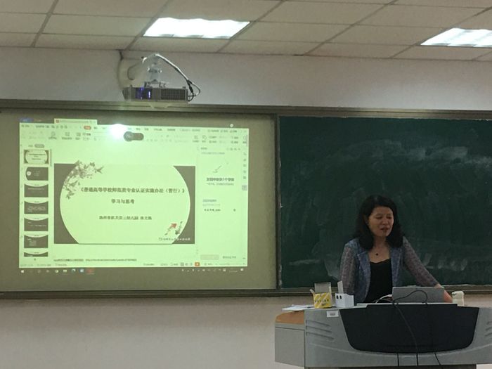 刘强教授作《准确理解论证标准,扎实做好论证准备》的专题报告,从专业认证理念、自评报告撰写、专家进校现场准备工作等诸多方面对师范专业认证工作进行深入浅出的阐述。她重点指出自评报告撰写模块中的常见问题及基本要求,提出指导性建议,为学院做好师范专业自评自建提供了科学有效的方法和宝贵的经验。沐文扬作《<普通高等学校师范类专业认证实施办法(暂行)>学习与思考》的专题指导报告,她围绕重温《办法》、论证体会、美好祝愿三个方面,结合相关认证案例,对师范专业认证工作的基本情况、主要举措、条件建设、自评要点和认证过程等方面进行了详细介绍。会上,学院教师与两位专家就认证工作中存在的问题展开了积极的交流讨论,两位专家一致认为学院对专业认证工作高度重视,并对我院专业认证准备工作给予了充分肯定。