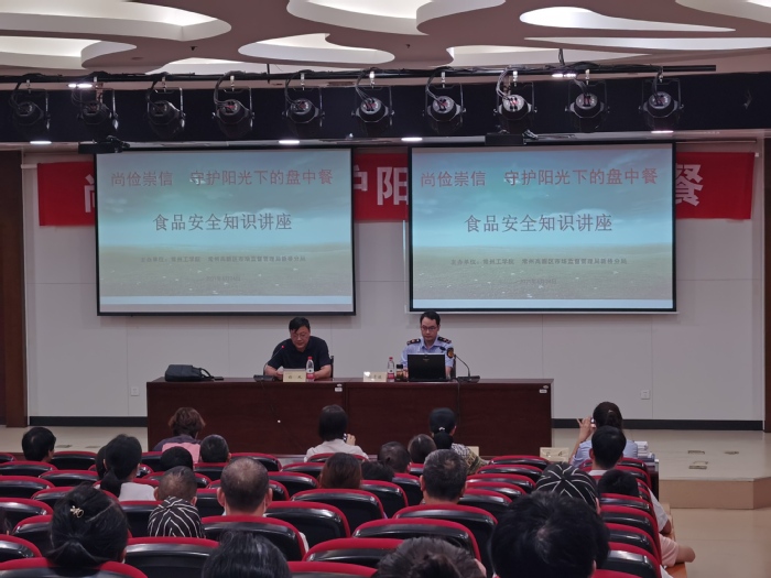 每年六月是全国的“安全生产月”,6月第三周为“食品安全宣传周”。今年的宣传主题是“落实安全责任,推动安全发展”、“尚俭崇信,守护阳光下的盘中餐”。安全工作重于泰山,6月24日下午,后勤管理处邀请常州新北区市场监管局食品安全监督管理处副处长谢贵骏和常州新北市场监管局新桥分局科长张婷来校开展安全生产“大讲堂”活动。我校食堂、商铺、物业、特种设备操作人员等后勤保障人员参加,后勤管理处处长彭政主持。