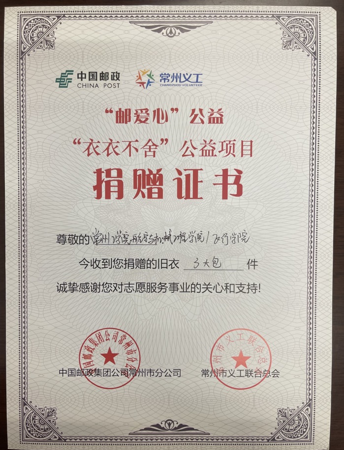 为扎实推进党史学习教育,认真开展“学史力行,我为群众办实事”,航空与机械工程学院/飞行学院与常州市新桥邮政支局联系,参加中国邮政集团公司常州市分公司和常州义工联合总会联合举办的“衣衣不舍”公益活动,向山区等偏远地区开展爱心帮扶。学院学生会积极响应爱心志愿公益行动,对历年学生活动闲置不用的衣物进行分拣清点统计,将70件左右的运动服装打包捐赠,让爱心通过衣物传递到每一个需要帮助的孩子手中。