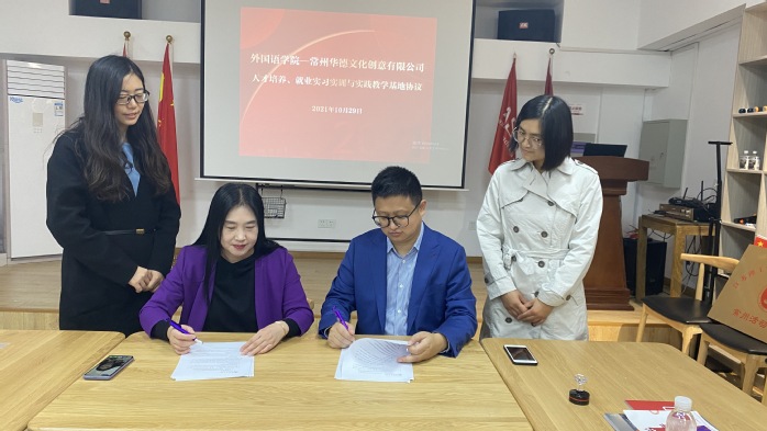双方参观了多家跨境电商直播工作室,研讨了新文科背景下校企合作模式实施的必要性与可行性,重点讨论了外国语学院《专业导学》《就业指导》以及《新媒体运营》等产教融合课程的改革问题,希望通过加大校企合作力度,推动学院应用型、复合型外语人才的培养。经过充分的沟通与交流,双方共同签署《人才培养、就业实习实训与实践教学基地协议》。