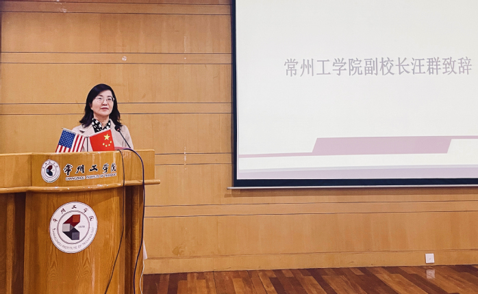 我校副校长汪群作致辞,她代表学校对2021级新生表达了殷切期望,希望学生珍惜项目提供的中美优质教育资源,克服可能遇到的困难努力求学。接着,她介绍了我校坚持开放办学的理念,培养专业+、商务化、柔性化、灵性化和中国化等“一专四化”高素质复合型涉外人才的目标,以及目前取得的成果,并要求国际交流合作处和相关二级学院要切实关心项目学生,通力合作,一起稳步推进项目开展。