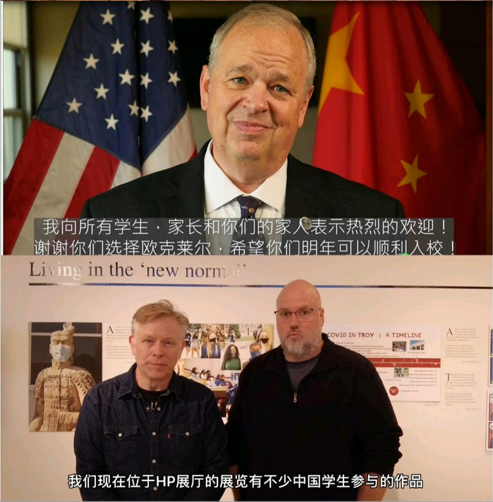 为欢迎新同学的到来,两所美方合作院校特别录制了学校介绍和欢迎视频。威斯康星大学欧克莱尔分校校长詹姆斯•施密特博士表示得益于极高的疫苗接种率和广泛的检测措施,学校可以回归正常状态,欢迎常州工学院新生们加入欧克莱尔大家庭,相信学生将在中美双方获得高质量的教育,商务英语+国际商务的双学位优势也将使得学生毕业后获得更强的竞争力;特洛伊大学两位专业教授向新生讲述了自己与中国的深厚渊源和对中国文化的喜爱,介绍了艺术与设计系的各类课程设置,并表示中国学生在课程和展览中的参与度极高,热切欢迎常工学子赴特洛伊大学学习。