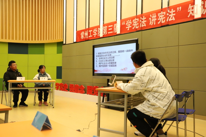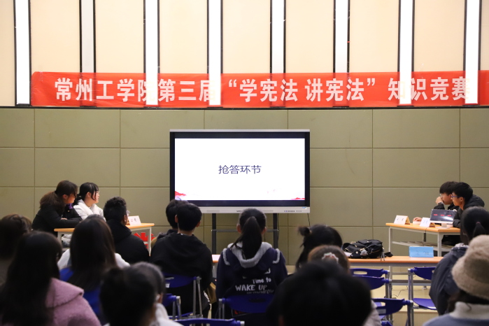为进一步引导广大同学准确把握习近平法治思想的基本精神、核心要义和实践要求,进一步坚定走中国特色社会主义法治道路的信心和决心,营造良好的宪法学习氛围,11月24日晚,常州工学院第三届大学生“学宪法讲宪法”知识竞赛在我校文化艺术中心B322举行,来自各二级学院的八个代表队伍同台竞争,角逐冠军。100余名学生观看决赛。