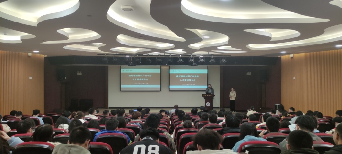 新创碳谷控股有限公司人事处经理王倩舒作主题报告,她从企业介绍、目前发展、未来规划、企业文化、公司福利、人才需求等方面全面介绍了公司在碳纤维材料领域取得的成就和未来规划,介绍了公司在人才方面的需求及待遇,表示了公司广纳贤才的愿望,热切欢迎我校学子的加盟。