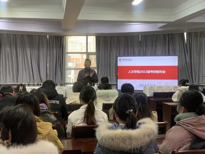 12月3日下午,人文学院举行2022届考研学生慰问会。院党委副书记曹鸣谦、副院长王振军及50余名考研学子参加此次活动。