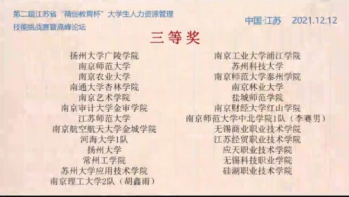 12月11日,第二届江苏省“精创教育杯”大学生人力资源管理技能挑战赛在线上进行。我校经济与管理学院组织管理决策模拟社团的三支队伍参加了比赛,其中一支队伍获得省总决赛资格并荣获三等奖。