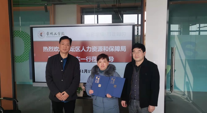 1月17日,金坛区人社局副局长王志东、人力资源考试培训中心主任吴志一行专程为我校送来喜报,感谢我校在南京都市圈青年大学生创业计划大赛给予金坛区的大力支持,并对经济与管理学院团委书记徐霞老师指导的项目获奖表示祝贺。