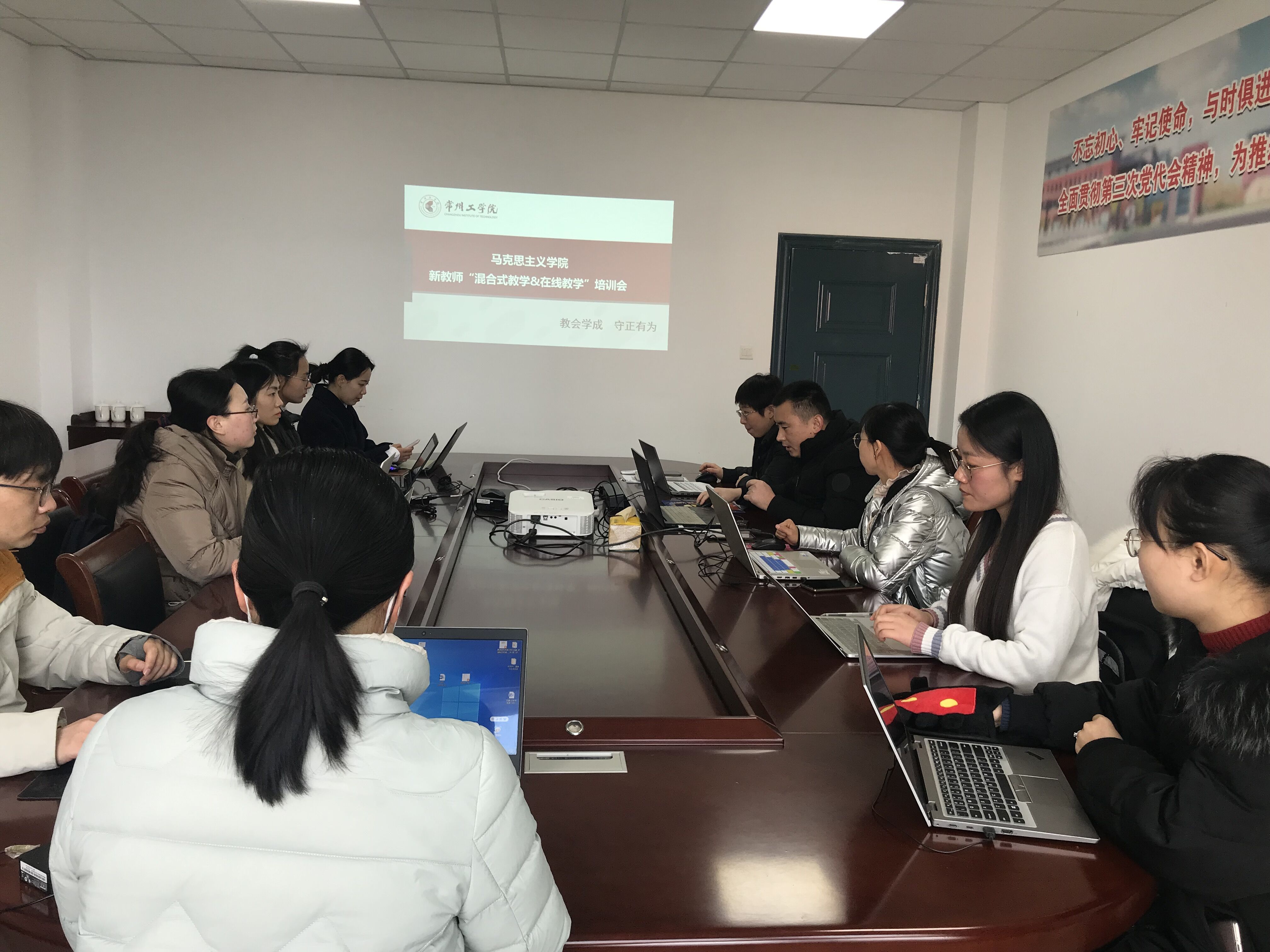 2月23日,马克思主义学院举行“混合式教学和在线教学”培训会,副院长夏天静主持会议,第二教研室主任张建才博士主讲,青年教师徐燕文、卞树明作教学技术指导。